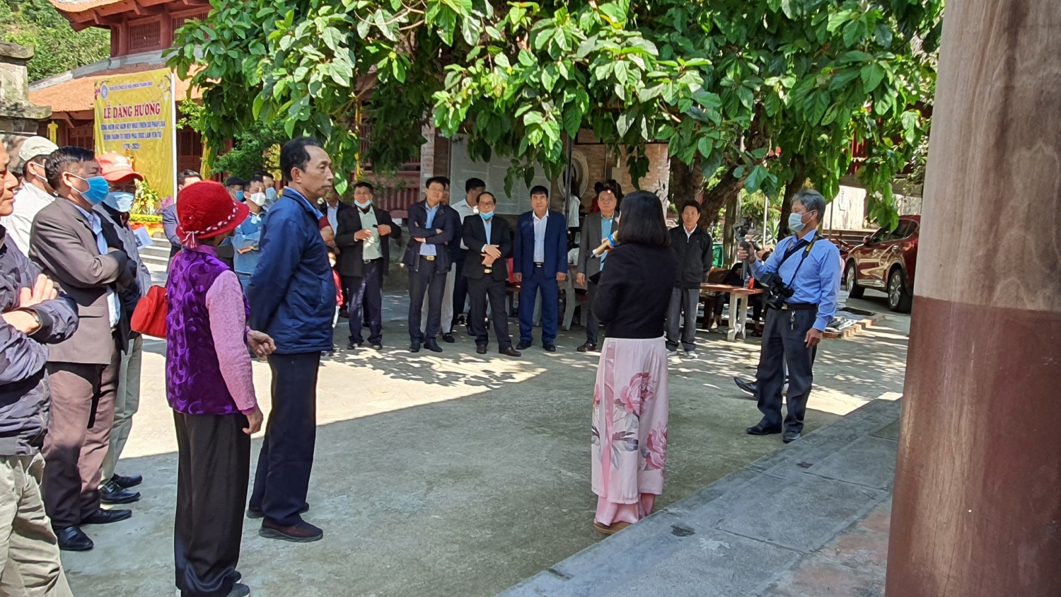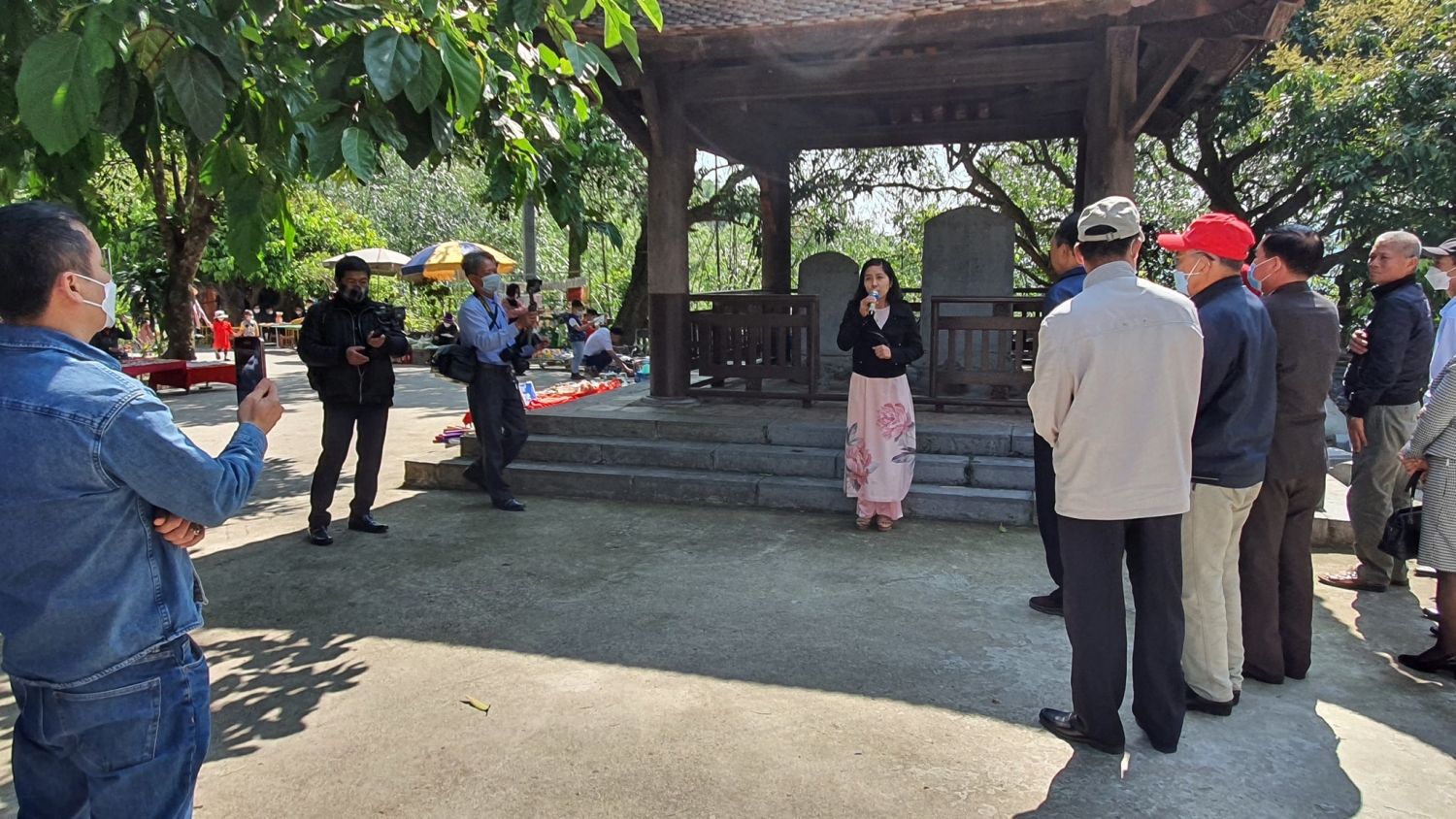 Các đại biểu nghe hướng dẫn viên Ban Quản lý Di tích TP thuyết minh về thiên sư Pháp Loa và di tích chùa Thanh Mai